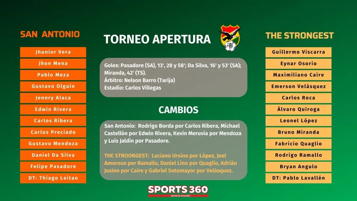 San Antonio, el benjamín de la División Profesional, goleó por 5 a 1 y de pasó humilló a The Strongest, el actual campeón nacional, en el partido reprogramado de la primera fecha del grupo A del torneo Apertura de la División Profesional, que se jugó en la tarde de este miércoles en el estadio Carlos Villegas, del municipio de Entre Ríos.