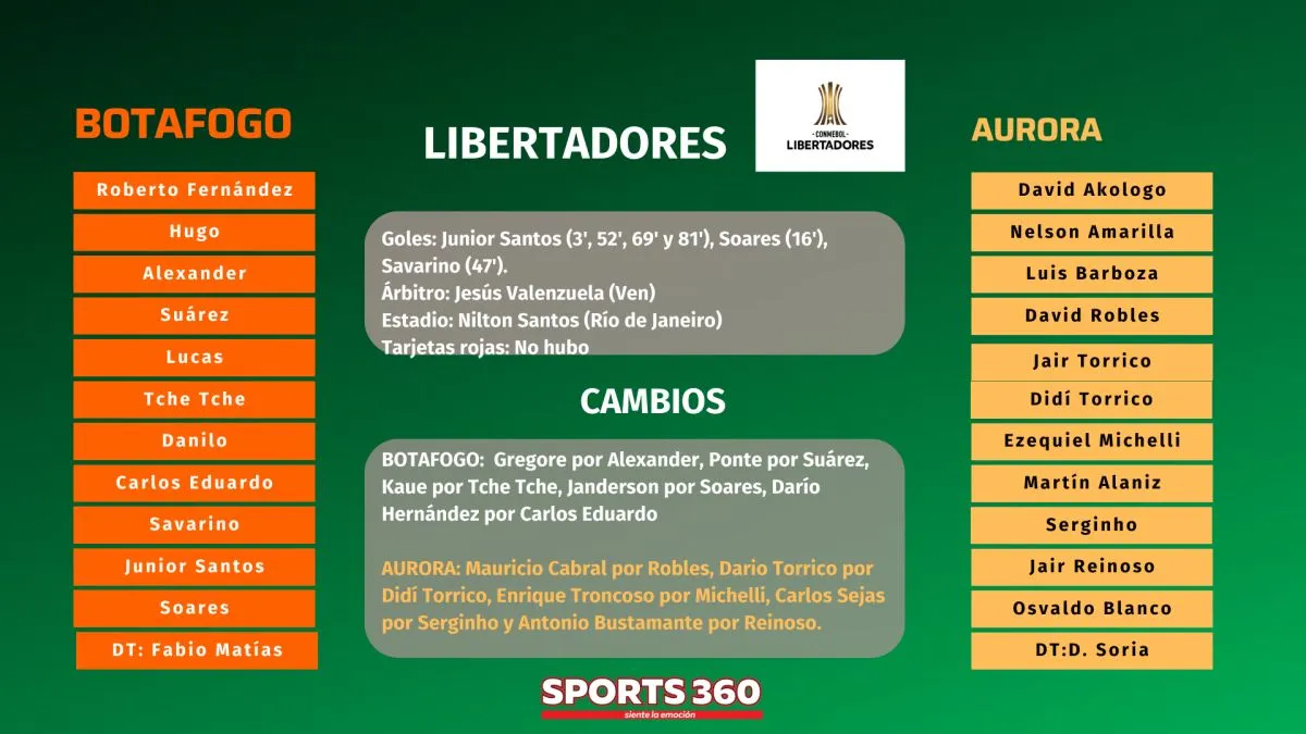 Botafogo avanzó sin despeinarse a la tercera fase de la Copa Libertadores, tras golear esta noche a Aurora por 6-0, en jornada inspirada de Junior Santos que aportó con cuatro goles al triunfo de su equipo, en lance jugado en el estadio Nilton Santos.