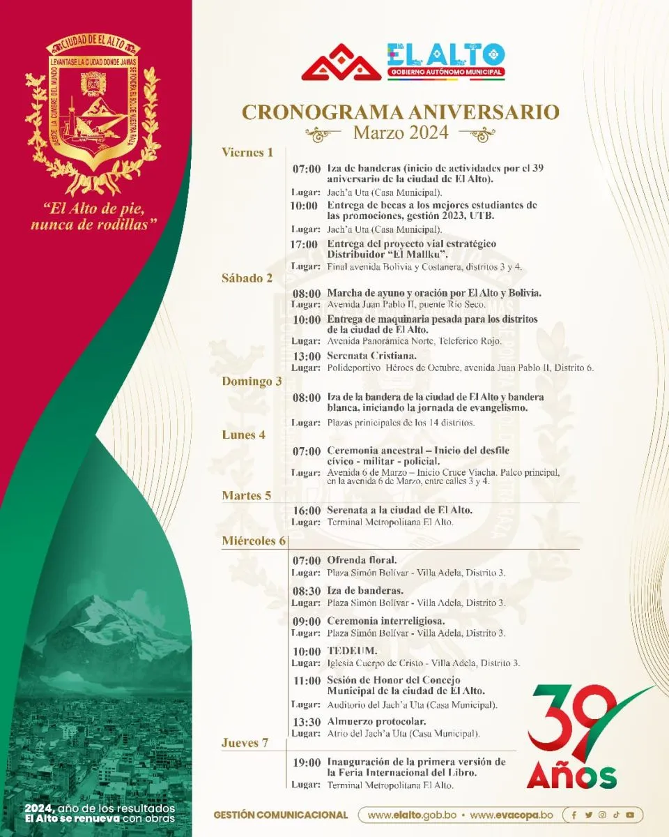 Esta jornada, según el cronograma de aniversario, el municipio alteño entregará becas a los mejores estudiantes de las promociones 2023 y presentará el proyecto vial estratégico distribuidor “El Mallku”.