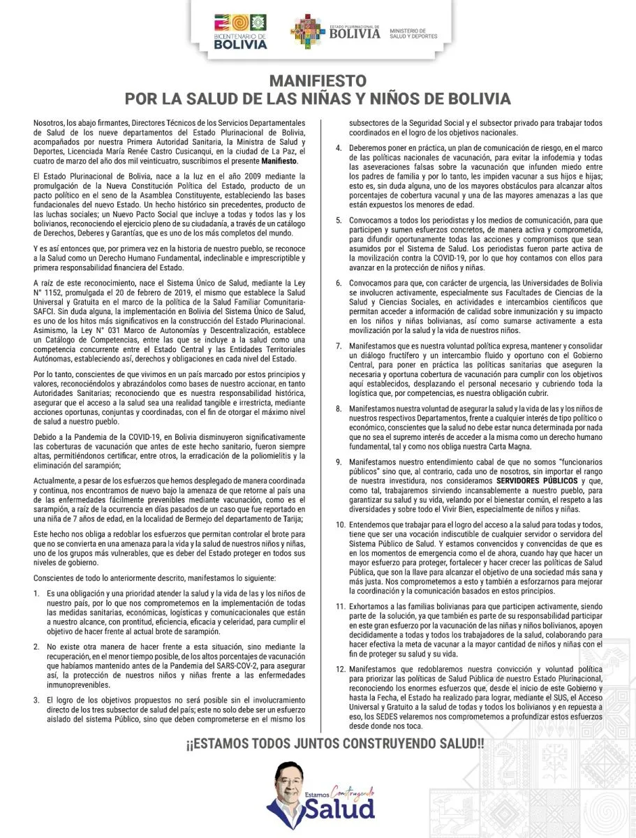 “Estamos aquí con los directores de los Servicios Departamentales de Salud en una ardua gestión técnica para evaluar la situación sobre las enfermedades inmunoprevenibles. No nos vamos a conformar solamente con un acta de reunión, sino con un Manifiesto por la Salud de las Niñas y Niños de Bolivia”, dijo la ministra de Salud y Deportes, María Renée Castro, tras la conclusión de la reunión de Alto Nivel Sanitario en el país.