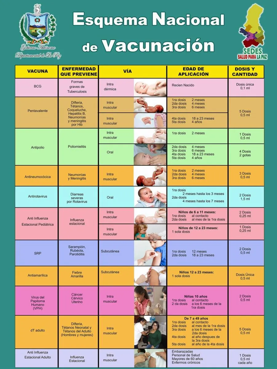 En Bolivia el esquema de vacunación para los niños y niñas, desde los cero hasta los dos años de edad, contempla ocho vacunas divididas en 21 dosis. Entre ellas se encuentra la BCG (que previenen formas graves de tuberculosis), la pentavalente (difteria, tétanos, coqueluche, hepatitis B, neumonías y meningitis), la antipolio, la antineumocócica, anti rotavirus, anti influenza, SRP (sarampión, rubeola y paperas) y antiamarillica.