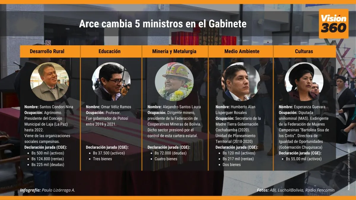 Los posesionados son: Santos Condori Nina como el nuevo ministro de Desarrollo Rural y Tierras; Humberto Alan Lisperguer Rosales, de Medio Ambiente; Alejandro Santos Laura, de Minería y Metalurgia; Omar Veliz Ramos, de Educación; y Esperanza Guevara como ministra de Culturas y Descolonización.