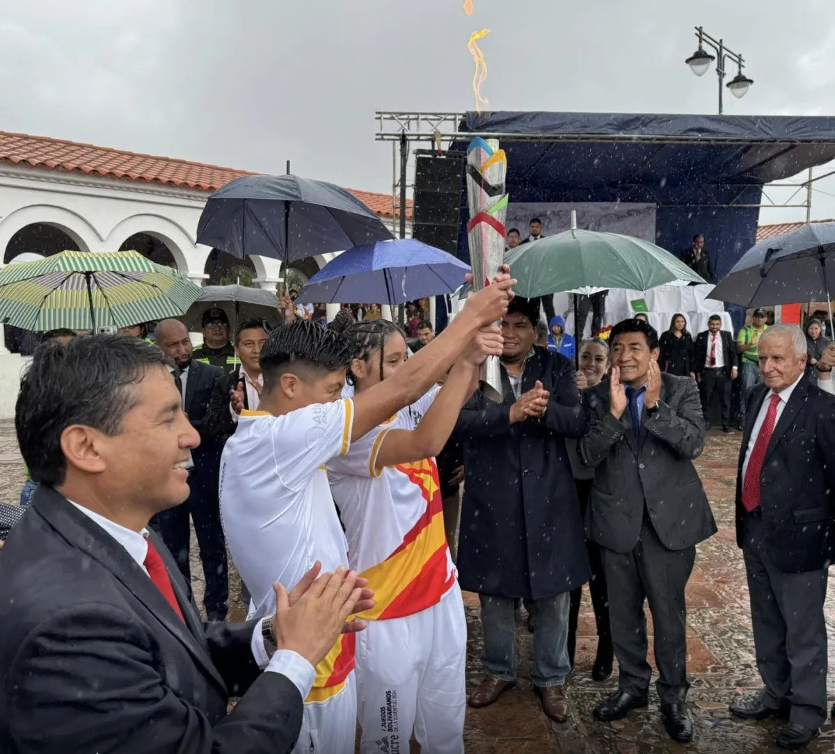 Los encargados de portar el símbolo bolivariano fueron los atletas chuquisaqueños Gerson Laura, de pelota vasca, y Daniela Daza, de taekwondo, quienes fueron escoltados por los otros 40 deportistas capitalinos que engrosarán las distintas selecciones nacionales que intervendrán en los Juegos.