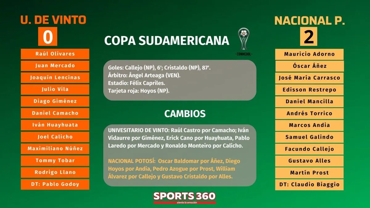 Nacional Potosí avanzó a fase de grupos de la Copa Sudamericana 2024, tras ganarle a Universitario de Vinto, que hacía su debut en el torneo internacional, por 0-2, en partido que se jugó en el estadio Félix Capriles de Cochabamba.