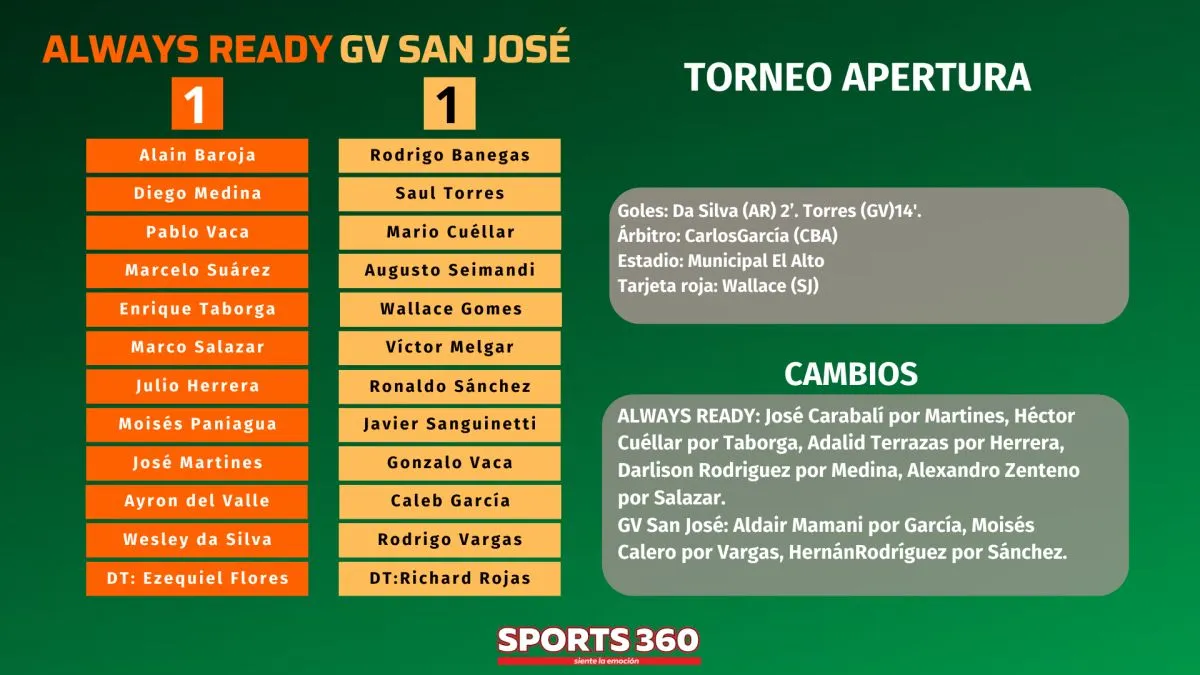 Parecía que se le venía la noche a GV San José porque a los 8 minutos fue expulsado Wallace Gomes tras falta a Paniagua, le pisó el tobillo. De manera extraña, con diez hombres jugaron mejor los orureños, mientras Always Ready no encontró la fuerza ofensiva que necesitaba para anotar un  gol más.
