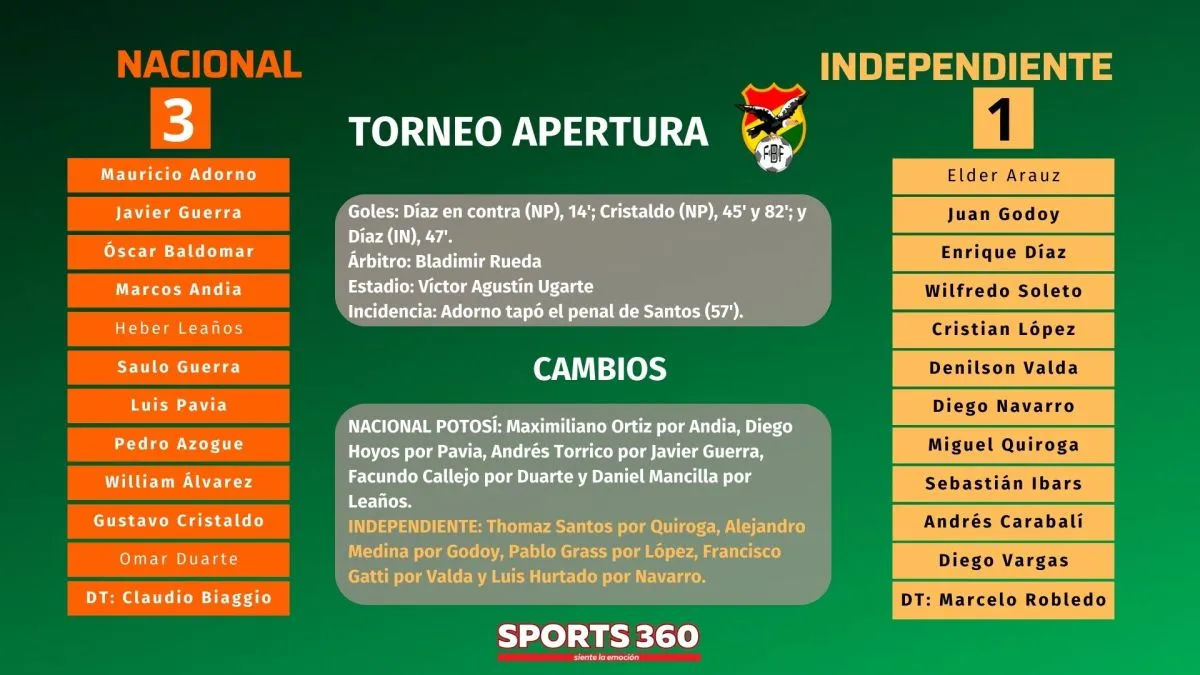 Nacional Potosí sigue con su invicto en el torneo Apertura y es líder indiscutible del Grupo B tras derrotar a Independiente (3-1), que no logra levantar cabeza en el campeonato, este sábado en el estadio Víctor Agustín Ugarte por la quinta jornada.