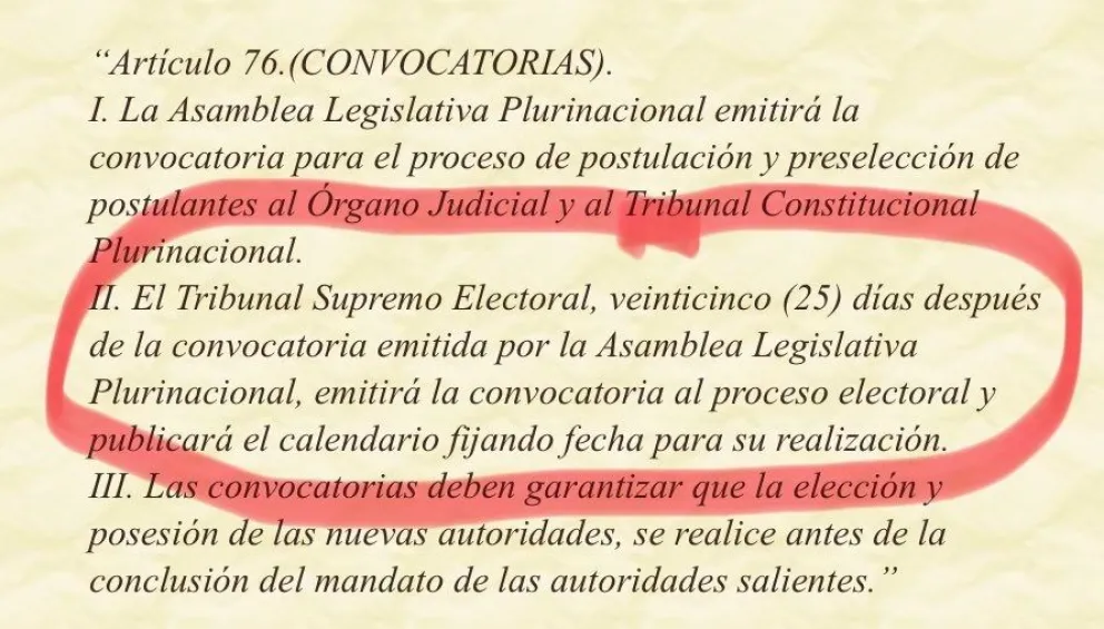 El documento señala: Convocatorias. I. La Asamblea Legislativa Plurinacional emitirá la convocatoria para el proceso de postulación y preselección de postulantes al Órgano Judicial y al Tribunal Constitucional Plurinacional. II. El Tribunal Supremo Electoral, veinticinco (25) días después de la convocatoria emitida por la Asamblea Legislativa Plurinacional, emitirá la convocatoria al proceso electoral y publicará el calendario fijando fecha para su realización. III. Las convocatorias deben garantizar que la elección y posesión de las nuevas autoridades, se realice antes de la conclusión del mandato de las autoridades salientes.