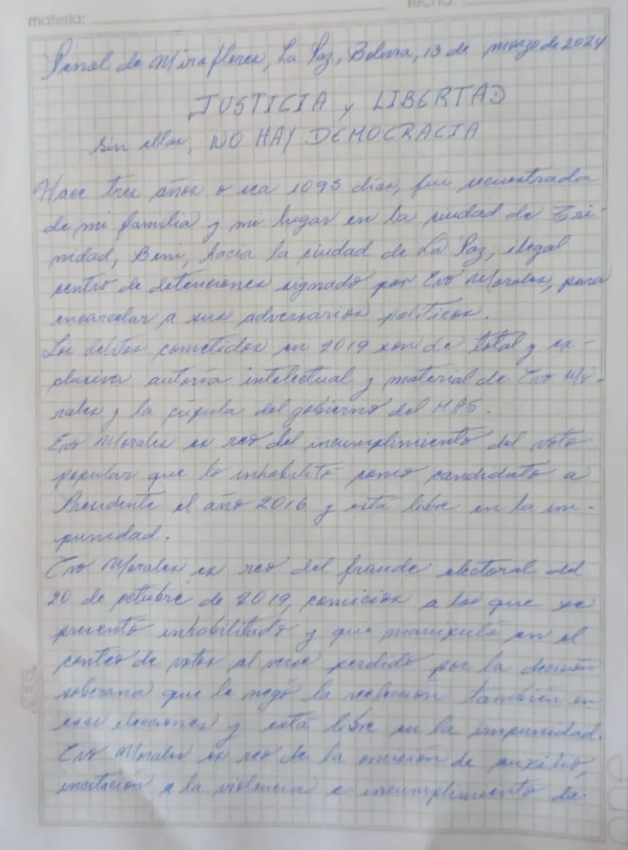 En la carta, la exmandataria sindica al expresidente de incitar a la violencia e incumplir deberes durante la crisis del año 2019. “Evo Morales es reo de la omisión de auxilio, incitación a la violencia e incumplimiento de deberes al haber permitido como Presidente que sus hordas atacaran a la población civil que salió a las calles de las ciudades y las comunidades bolivianas a protestar legítima y pacíficamente ante el escandaloso fraude electoral”, agrega en el escrito.