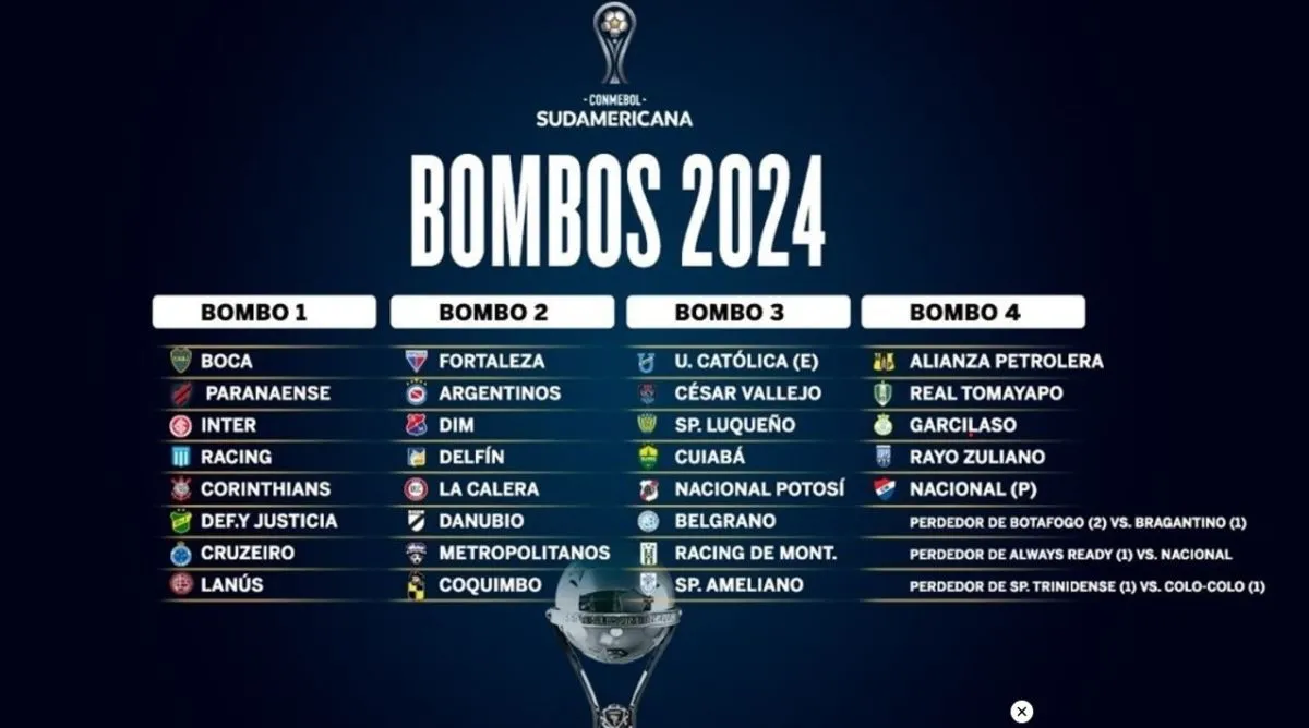 Los clubes bolivianos Nacional Potosí y Real Tomayapo empezarán como locales su participación en Copa Sudamericana 2024, después de que Conmebol definió a la conformación de los cuatro bombos para el sorteo del lunes 18, en Luque, Asunción, Paraguay.