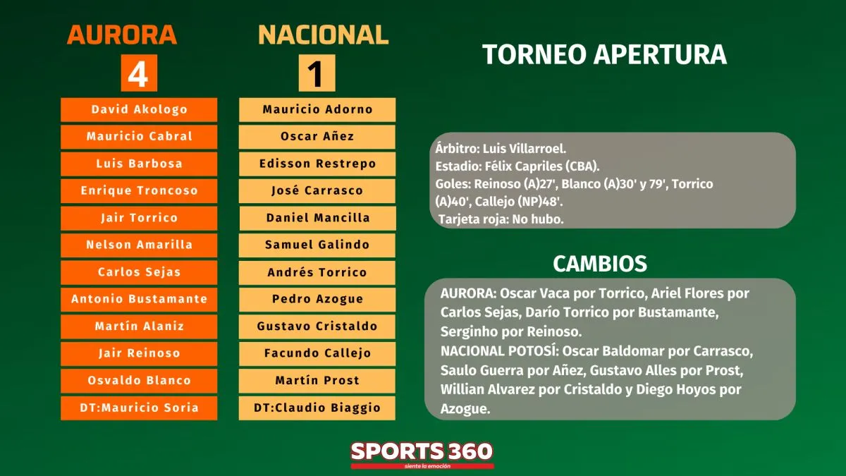 Aurora intentó reaccionar ante la embestida de Nacional Potosí que no pudo anotar. Y, cuando parecía que iba a seguir anotando el cuadro potosino, fue Aurora el que sentenció el partido con un remate de Reinoso que pegó en el travesaño, el rebote fue empalmado por Blanco para el 4-1, a los 79 minutos.