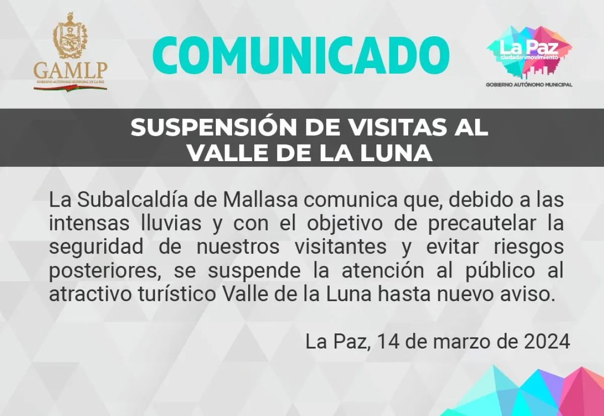 "La subalcaldía de Mallasa comunica que debido a a las intensas lluvias y con el objetivo de precautelar la seguridad de nuestros visiatntes y evitar riesgos posteriores, se suspende la atención al público al atractivo tutistico Valle de la Luna hata nuevo aviso", señala el comunicado de la Subalcaldía.