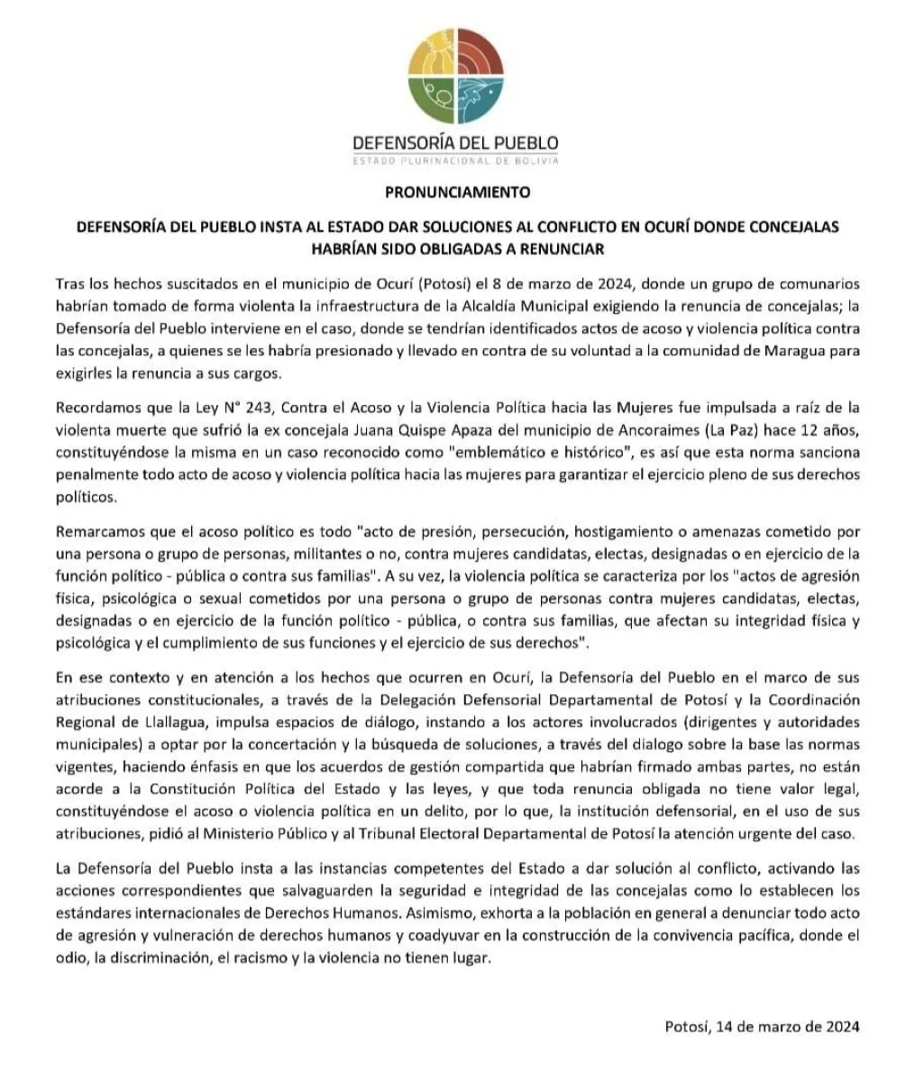 La Defensoría del Pueblo, mediante un pronunciamiento, instó este jueves a las instituciones del Estado a solucionar el conflicto en el municipio de Ocurí, departamento de Potosí, donde se obligó a concejalas a renunciar a sus cargos.