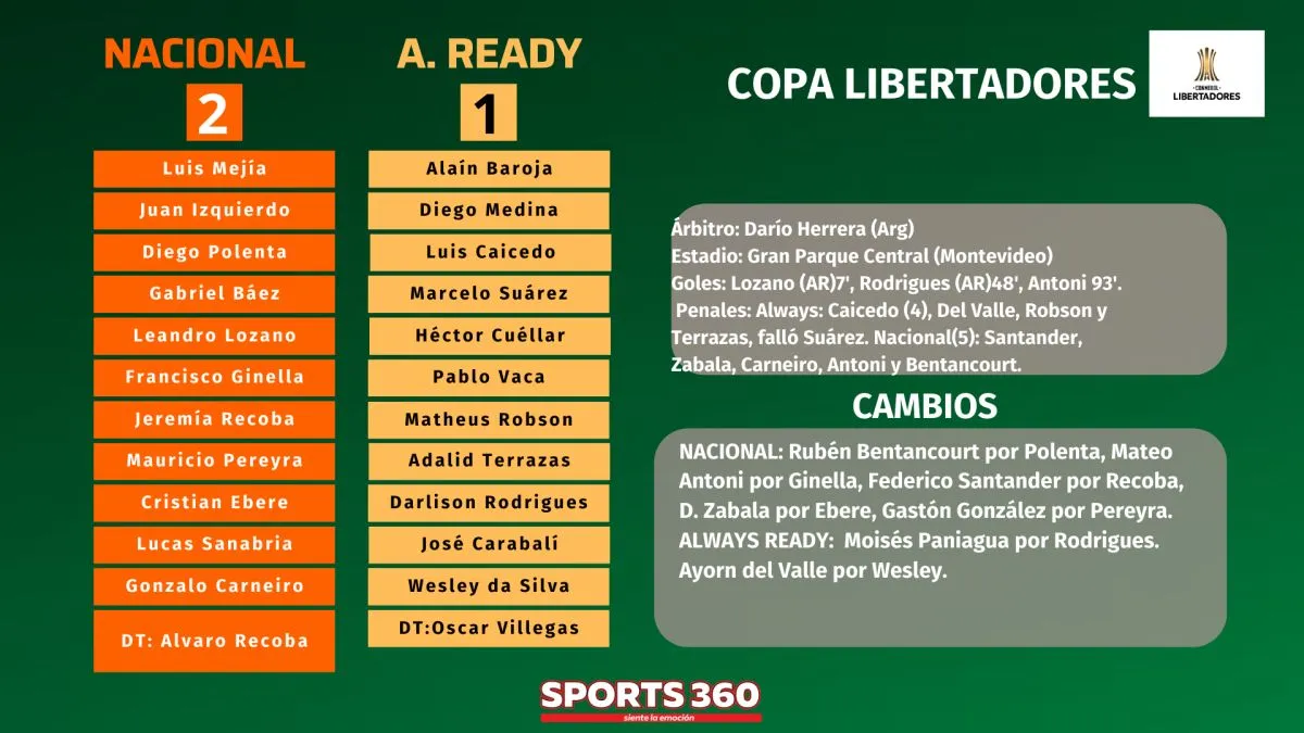 La llave estaba empatada, dos a dos, y a la definición en los penales. Anotaron para Always Ready Caicedo, Del Valle, Robson y Terrazas, falló Suárez; para Nacional, marcaron todos, Santander, Zabala, Carneiro, Antoni y Bentancourt.