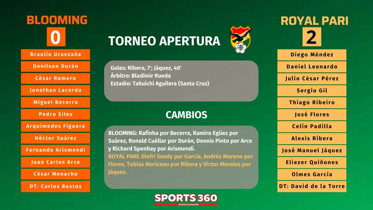 Royal Pari derrotó a Blooming 0-2 este viernes en el estadio Tahuichi Aguilera y apretó el Grupo B del Torneo Apertura de la División Profesional, en el cierre de la sexta jornada.
