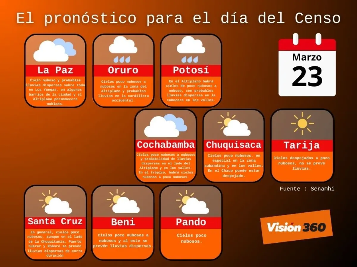 El día del Censo de Población y Vivienda el clima mejorará en Bolivia, aunque según el Servicio Nacional de Meteorología e Hidrología (Senamhi), habrá cielos nubosos y probables lluvias en algunos departamentos del país.