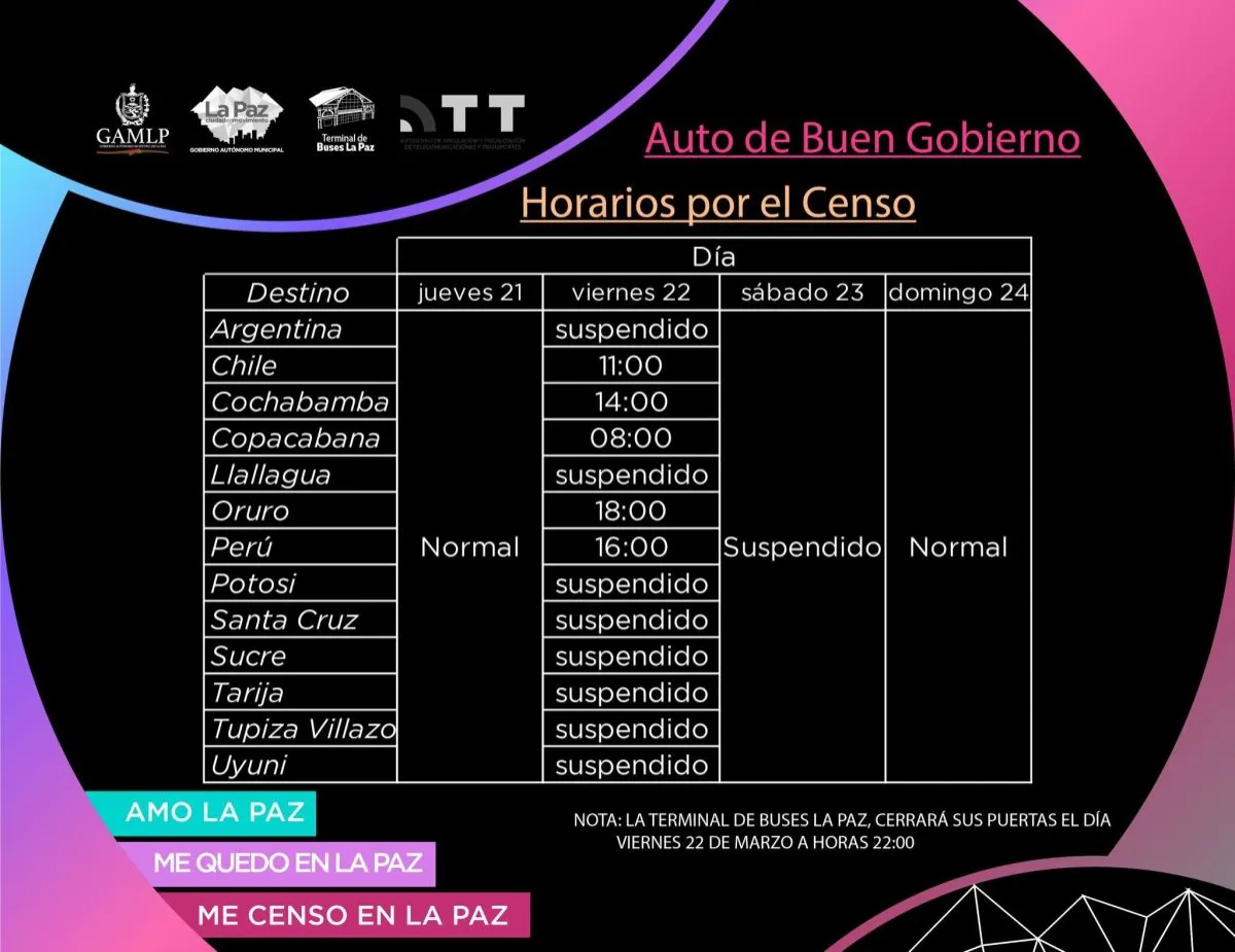 El director de la Terminal de Buses de La Paz, Juan Américo Gemio, informó este miércoles que la terminal de La Paz y la terminal de Minasa permanecerán cerradas este próximo sábado 23 de marzo, día del Censo nacional.