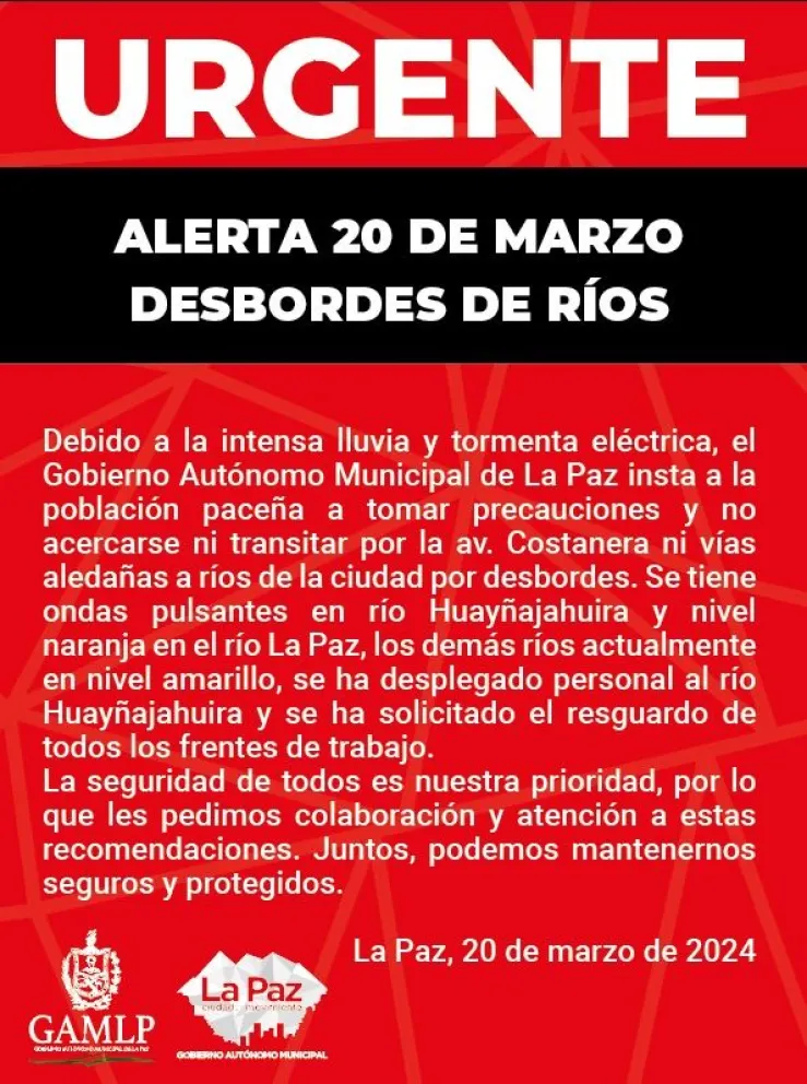 La Alcaldía emitió un comunicado anunciando el peligro que representa el río Huayñajahuira, que transita paralelamente a la avenida Costanera en Calacoto. En la alerta se pide a la población no circular por dicha vía.