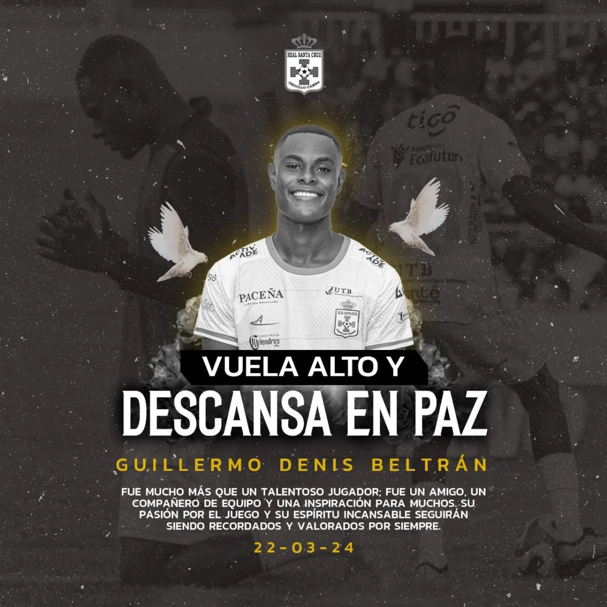 El futbolista colombiano Guillermo Denis Beltrán, quien se entrenaba hoy en filas de Real Santa Cruz, murió luego de una descompensación que sufrió en pleno entrenamiento de la que no pudo reponerse.
