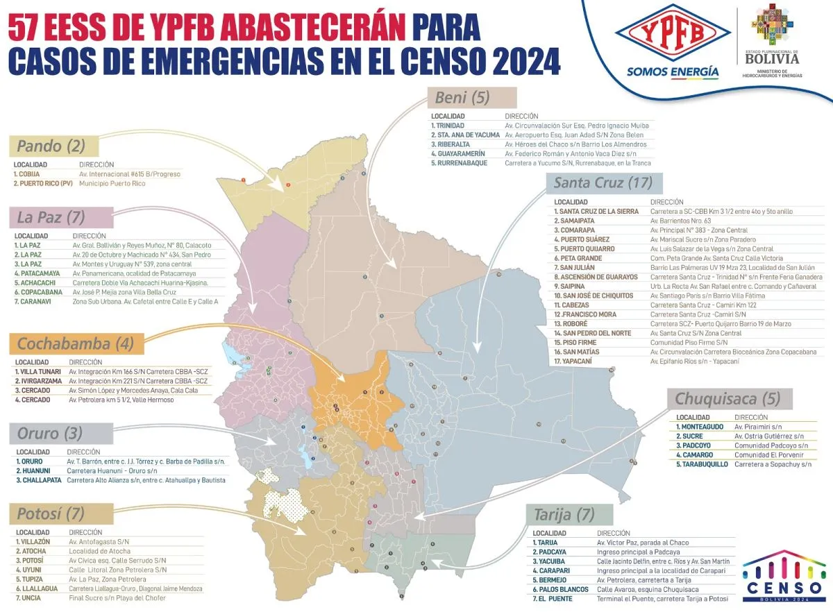 Durante la jornada del censo, este sábado 23 de marzo, 57 estaciones de servicio de Yacimientos Petrolíferos Fiscales Bolivianos (YPFB) abastecerán, en el territorio nacional, a los vehículos que circularán con autorización.