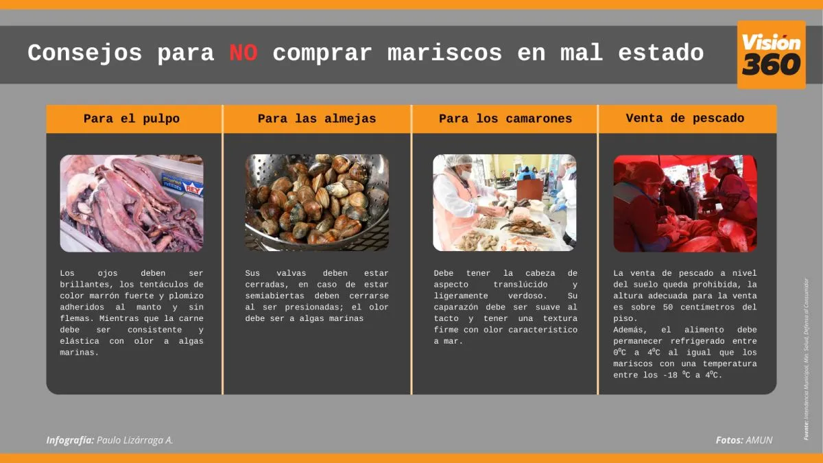 Para los frutos de mar también hay recomendaciones. Lo primero es verificar las condiciones de transporte y conservación. Estos productos deben mantenerse con una temperatura entre los -18 a cuatro grados centígrados. En todos los casos deben tener olor a algas marinas.