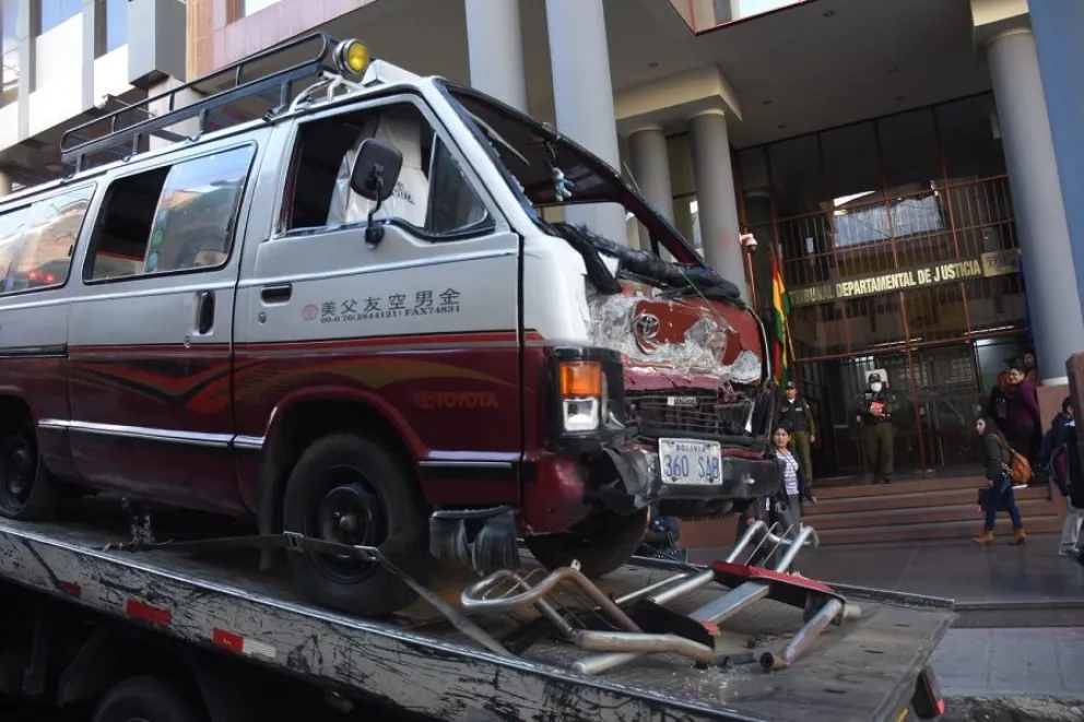 El minibús del servicio público que se estrelló en la fachada del TDJ de La Paz. Foto: APG