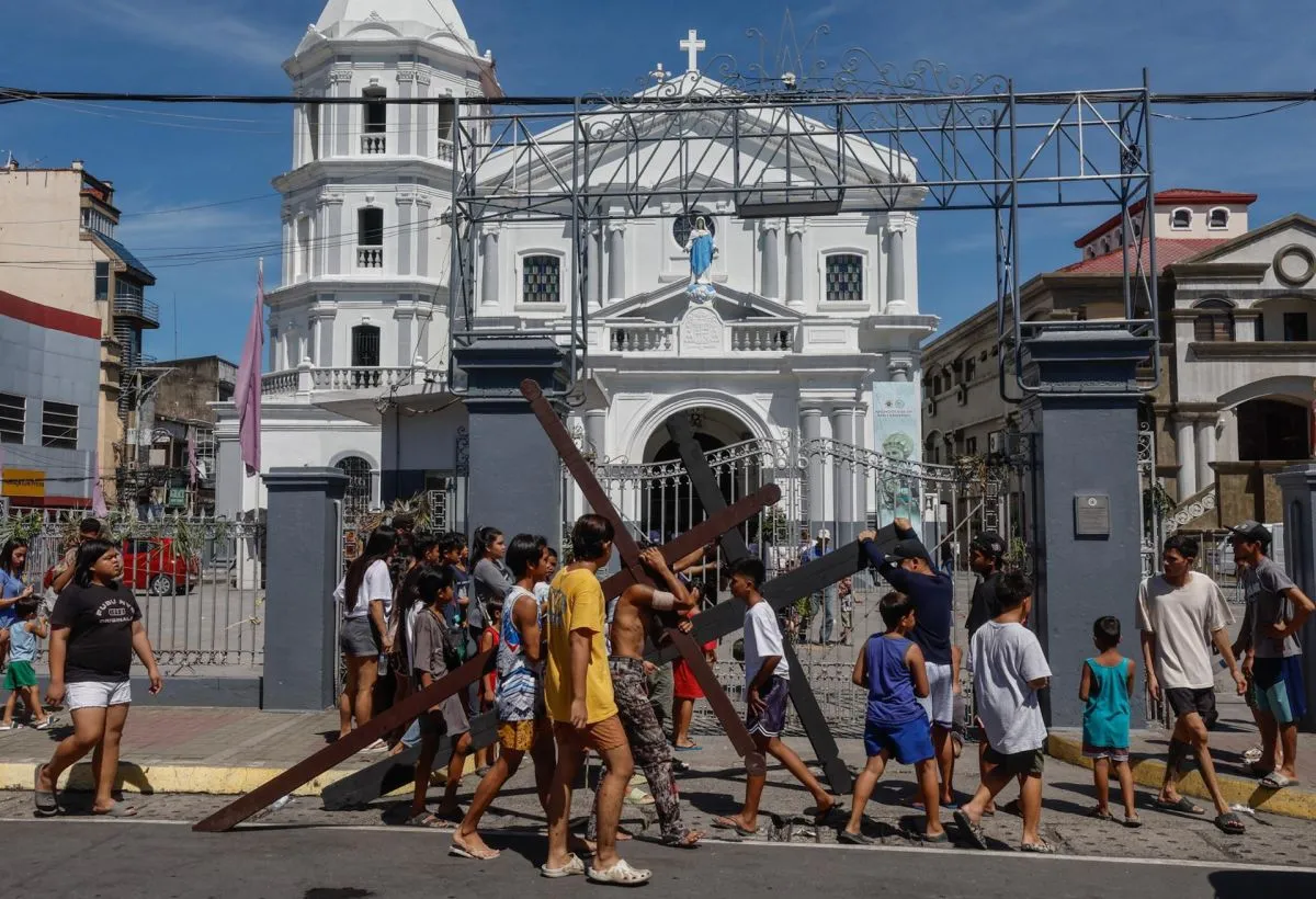 Penitentes católicos cargan con cruces de madera frente a la catedral de San Fernando, en Filipinas, Foto:EFE