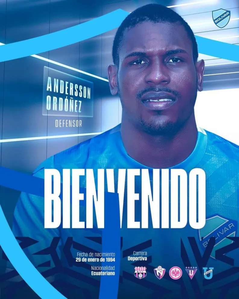 El defensor ecuatoriano Andersson Ordóñez (Guayaquil, 29 de enero de 1994), quien llegó a jugar en Alemania, es el nuevo refuerzo de Bolívar para la presente temporada, anunció el club celeste este sábado en sus redes sociales.
