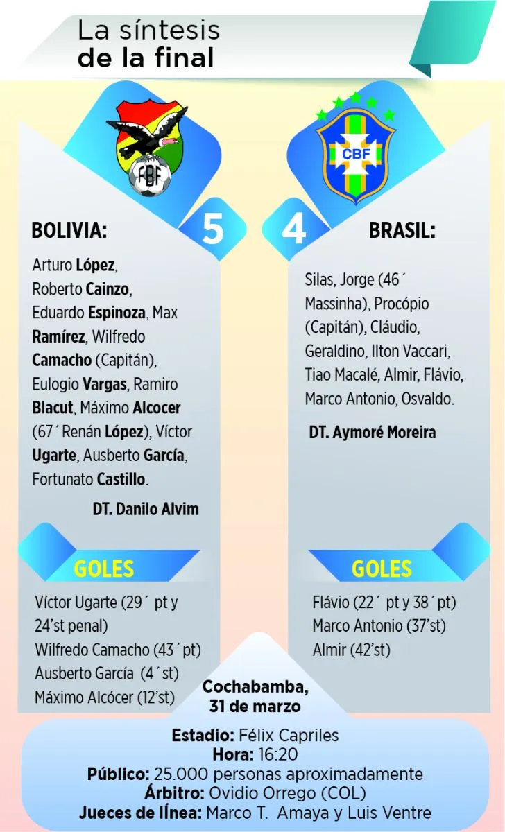Antes del descanso Flavio anotó el segundo y Camacho empató 2-2. En el segundo tiempo Ausberto García adelantó a la verde, Máximo Alcócer puso el cuarto y el quinto fue de Ugarte mediante tiro penal, en la jugada previa Alcócer sufrió una doble fractura de la tibia. Los brasileños reaccionaron con goles de Marco Antonio y Almir, pero la suerte estaba sellada a favor de Bolivia que conquistó su único título en su historia deportiva  y que festejó ruidosamente en todo el territorio nacional.