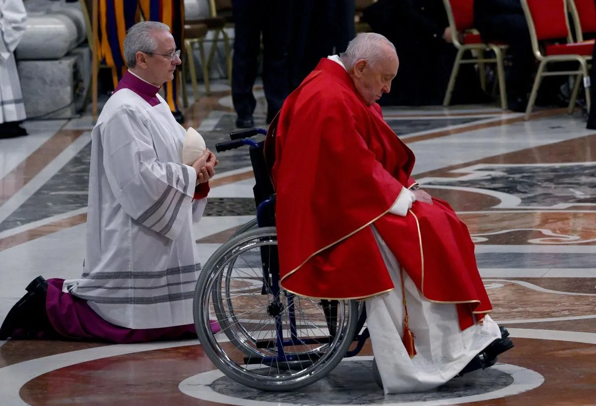 Francisco accedió al templo en la silla de ruedas que suele usar por sus conocidos problemas de movilidad, vestido con los paramentos rojos de la Pasión y sin el anillo del Pescador, símbolo del poder papal y que este día los papas se quitan en señal de duelo.