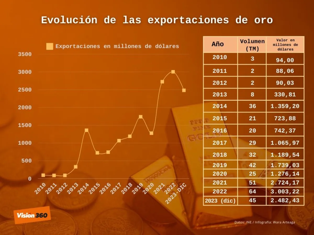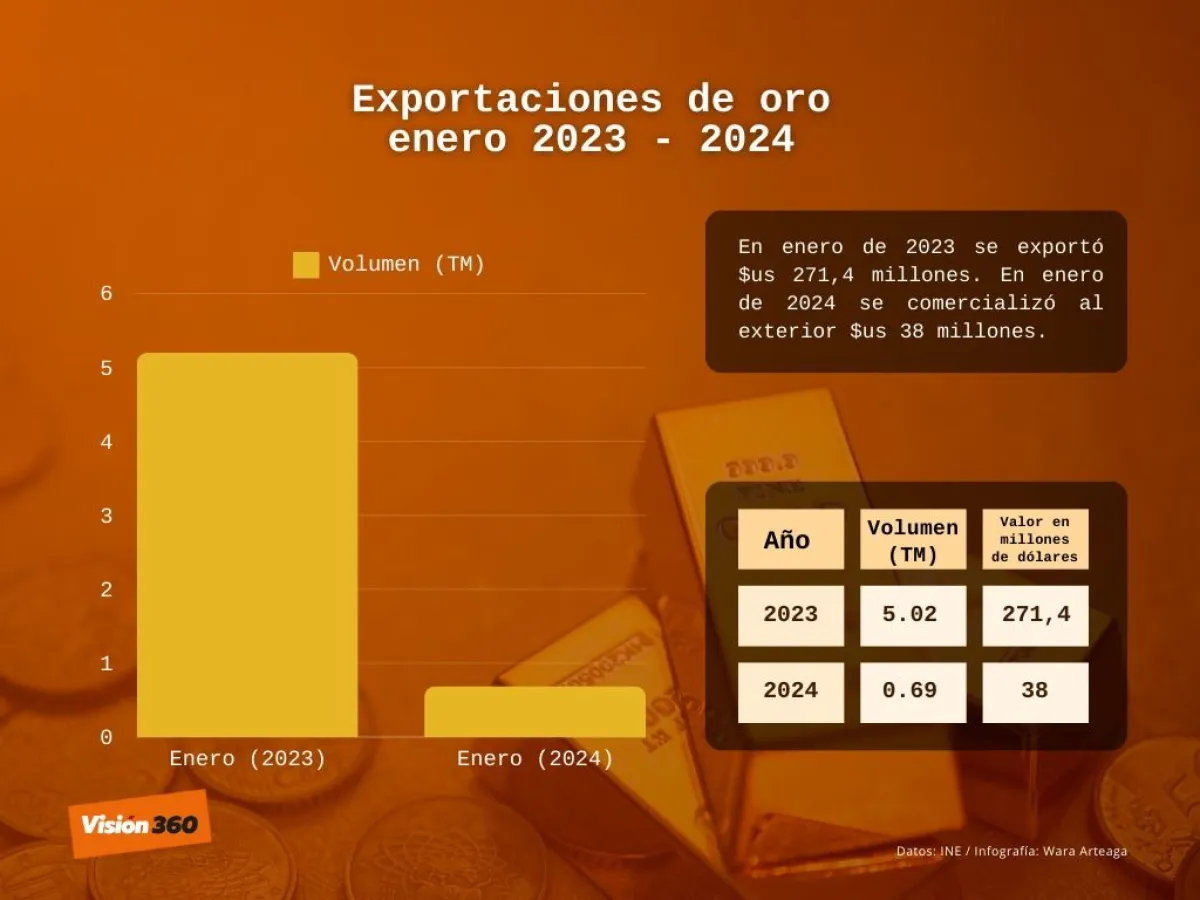 Luego de marcar récord en los últimos años, las exportaciones de oro se desplomaron en 86% al caer las ventas al exterior de 271,4 millones de dólares, registrado en enero 2023, a 38 millones de dólares, reportado en enero 2024, según datos del Instituto Nacional de Estadística (INE). Un experto ve que el metal aún sale de forma ilegal y la Caneb atribuye como una causa la regulación de parte del Banco Central de Bolivia (BCB).