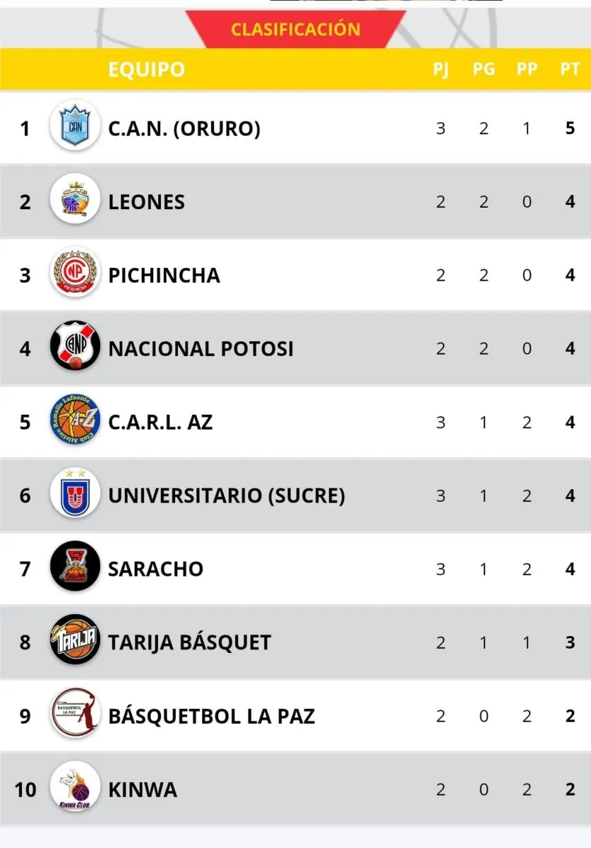 CAN lleva jugados tres partidos y gracias a ello tiene 5 unidades. El encuentro por la tercera jornada, que se llevó adelante el sábado 5 en el Luis Lazzo Quinteros, ganó Universitario de Sucre (92-89).