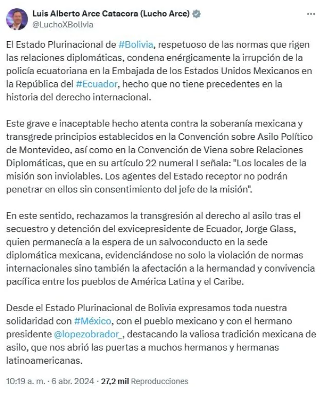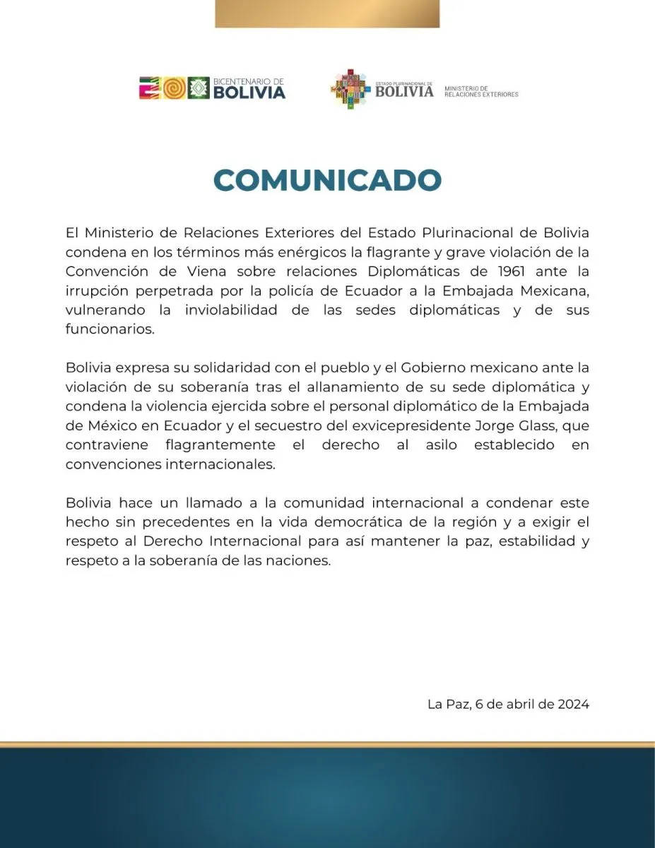 Asimismo, la Cancillería de Bolivia emitió un comunicado en el que "condena" de manera enérgica "la flagrante y grave violación de la Convención de Viena sobre relaciones Diplomáticas", también expresa su solidaridad con México por la violación de su soberanía y llama a la comunidad internacional a "condenar este hecho sin precendentes".