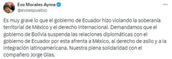 Evo Morales calificó como "grave" lo sucedido y demandó al gobierno de Bolivia suspender sus relaciones diplomáticas con Ecuador.