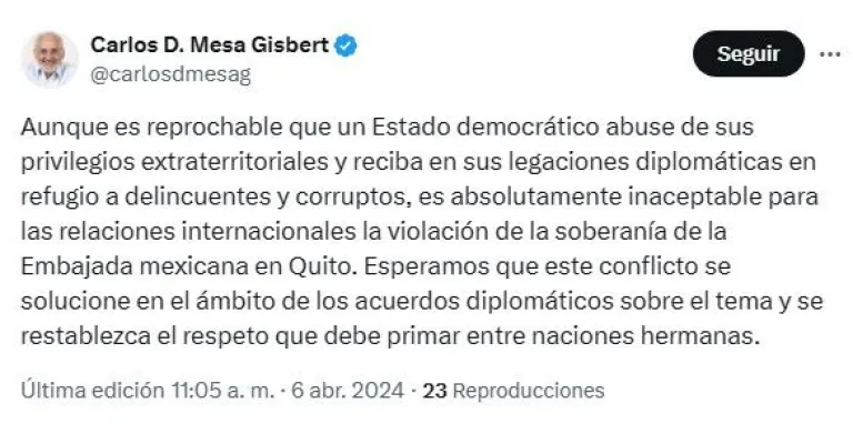 Carlos Mesa dijo que es "inaceptable" para las relaciones internacionales la violación de la soberanía de la embajada de México, aunque reprochó el que un Estado democrático "abuse de sus privilegios extraterritoriales" para recibir en sus legaciones diplomáticas a delincuentes y corruptos.
