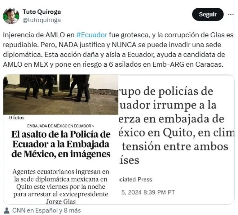 Jorge "Tuto" Quiroga  a su vez dijo que "nada justifica y nunca se puede invadir una sede diplomática", aunque recuerda que la corrupción de Glas es repudiable.