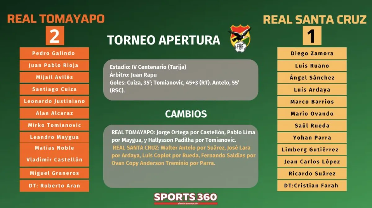 Real Tomayapo terminó su participación en el Torneo Apertura con un apretado 2-1 sobre Real Santa Cruz este domingo en el estadio IV Centenario de Tarija, por la octava jornada del Torneo Apertura de la División Profesional.