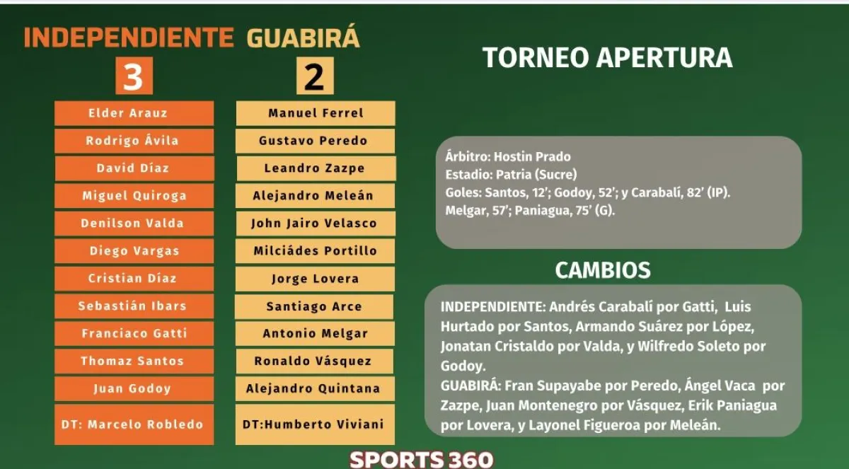 Independiente de Sucre derrotó a Guabirá 3-2 este lunes en el estadio Patria de Sucre y se clasificó a los cuartos de final del Torneo Apertura de la División Profesional.