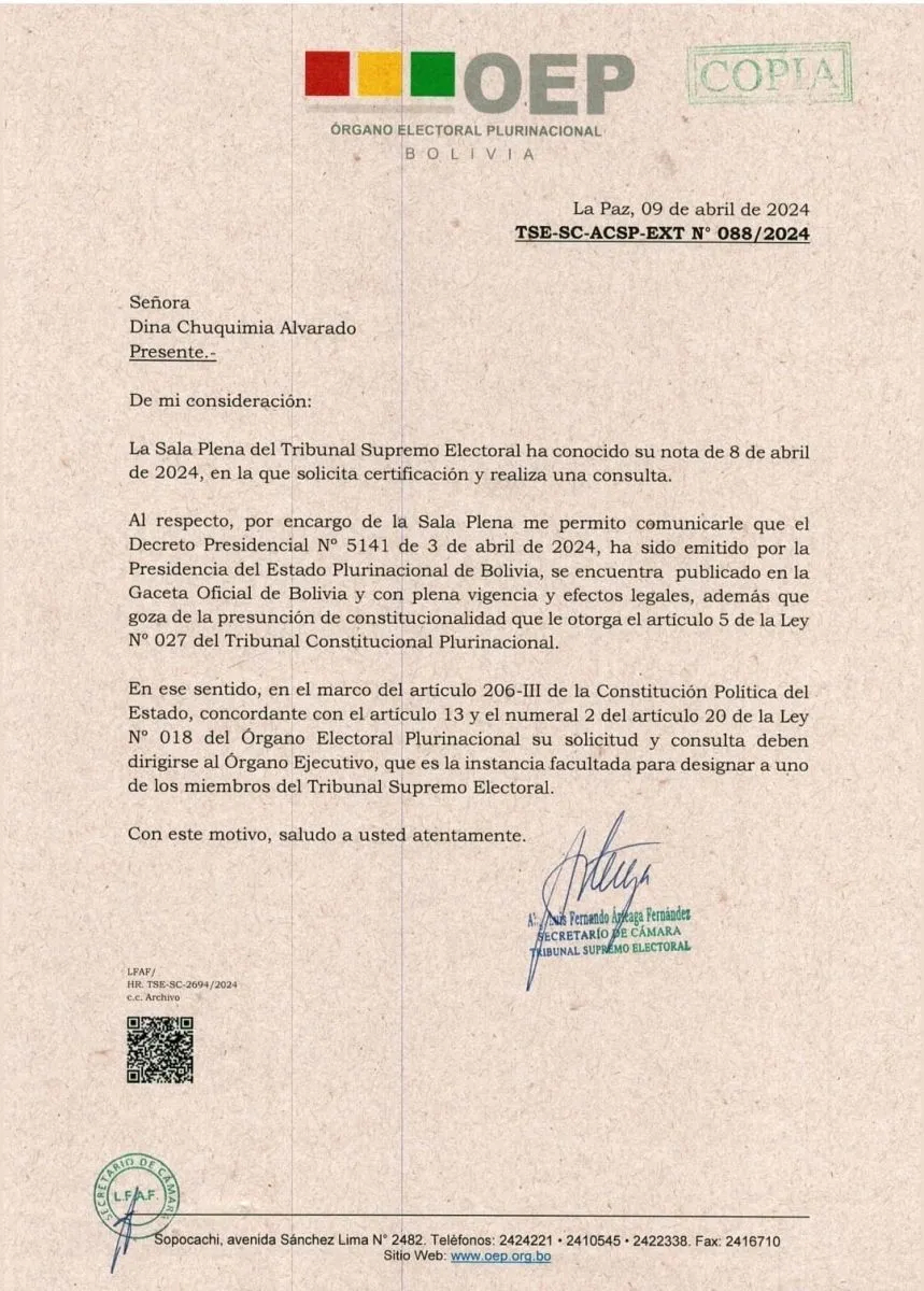 “Por encargo de la Sala Plena me permito comunicarle que el Decreto Presidencial N° 5141 de 3 de abril de 2024, ha sido emitido por la Presidencia del Estado Plurinacional de Bolivia, se encuentra publicado en la Gaceta Oficial de Bolivia y con plena vigencia y efectos legales, además que goza de la presunción de constitucionalidad”, se lee en la misiva, fechada en 9 de abril, que remitió el secretario de cámara del TSE, Fernando Arteaga, a Chuquimia.
