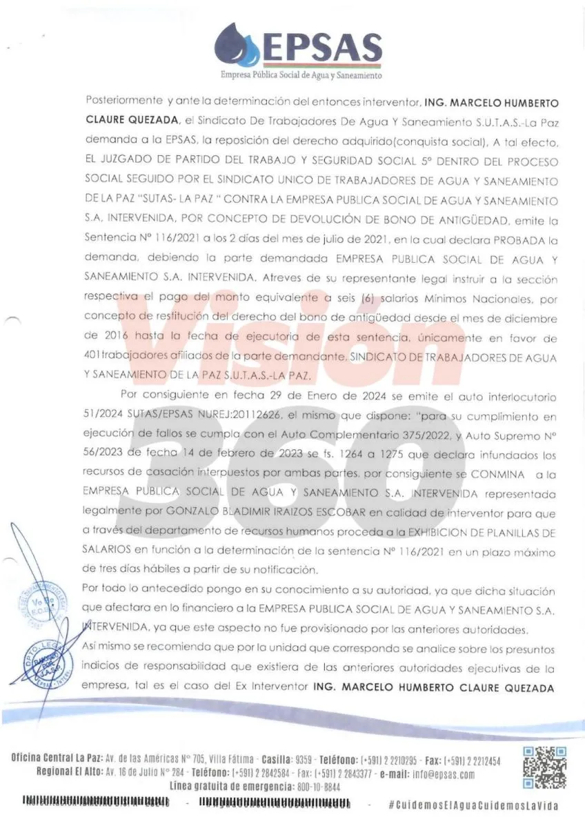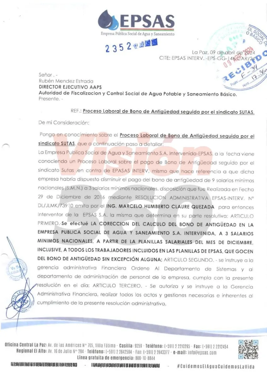 El informe fue enviado el 9 de abril y tiene como referencia: “Proceso laboral de bono de antigüedad seguido por el Sutas (Sindicato de Trabajadores de Agua y Saneamiento de La Paz)”. De acuerdo a los antecedentes, la nota sería una respuesta a las consultas que la APSS hizo a Epsas S.A. por dicho fallo.