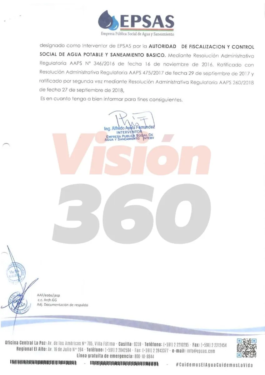 El documento, firmado por Ayala está dirigido al director de la Autoridad de Fiscalización y Control Social de Agua Potable y Saneamiento Básico (AAPS), Rubén Méndez, quien fue ministro de Medio Ambiente y Agua (MMAyA) hasta el 3 de marzo.