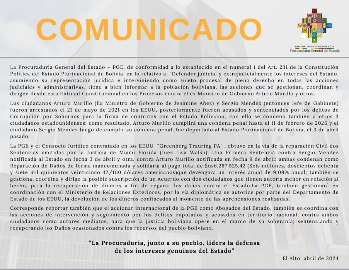 La Procuraduría General del Estado (PGE) anunció este miércoles que realizará gestiones por la vía diplomática para que se autorice la devolución de los dineros confiscados al exministro de Gobierno, Arturo Murillo, en el momento de su aprehensión en Estados Unidos (EEUU).