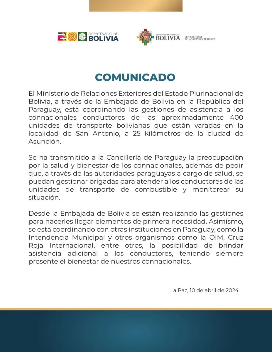 “El Ministerio de Relaciones Exteriores del Estado Plurinacional de Bolivia, a través de la Embajada de Bolivia en la República del Paraguay, está coordinando las gestiones de asistencia a los connacionales conductores de las aproximadamente 400 unidades de transporte bolivianas que están varadas en la localidad de San Antonio”, señala el comunicado que emitió la Cancillería.