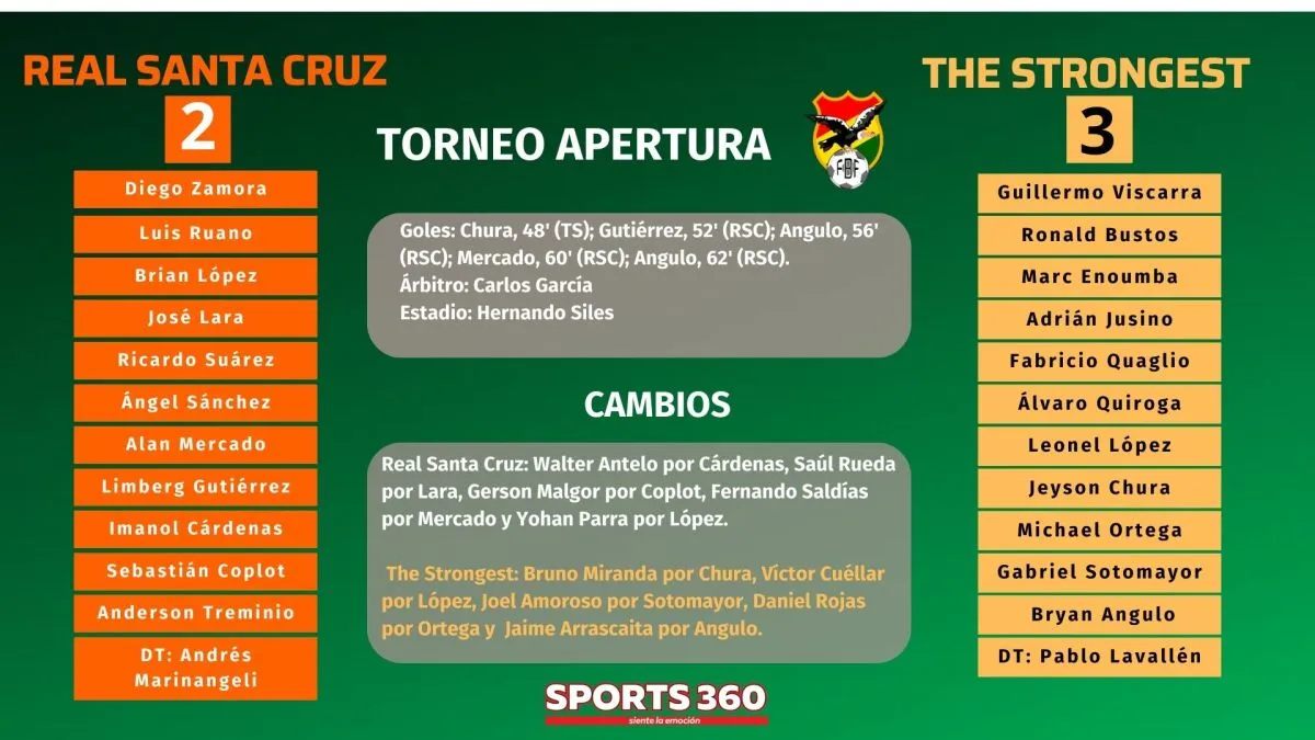 The Strongest consiguió su primer triunfo de visitante en el torneo Apertura, se impuso a Real Santa Cruz por 2 a 3, partido reprogramado de la fecha siete, que le sirvió para terminar en el primer lugar del Grupo A y ahora espera a por GV San José en los cuartos de final.