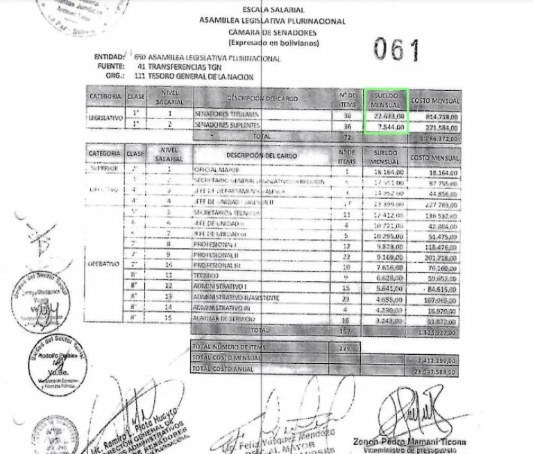 Sí. El equipo de Bolivia Verifica revisó el salario de los senadores y el documento muestra que cada representante departamental titular percibe Bs 22.633, mientras que los suplentes ganan Bs 7. 544.