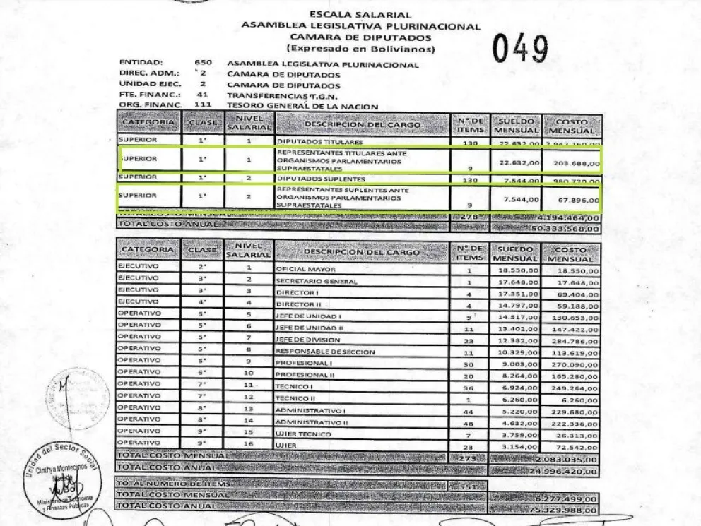 Con respecto al gasto en diputados, cada uno gana Bs 22.632 los titulares y Bs 7.544 los suplentes cada mes.