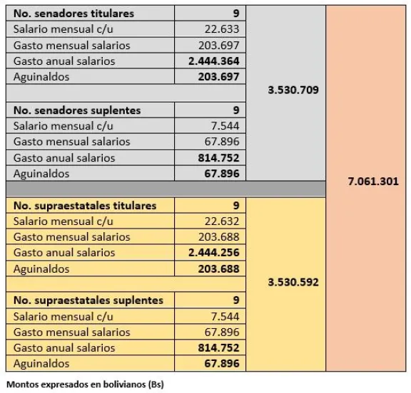 Considerando la propuesta de Paz Pereira —la de crear cinco diputaciones—, el monto requerido anualmente para cubrir estos ítems sería de Bs 1.961.440 (un millón novecientos sesenta y un mil cuatrocientos cuarenta), sumando salarios y aguinaldos.