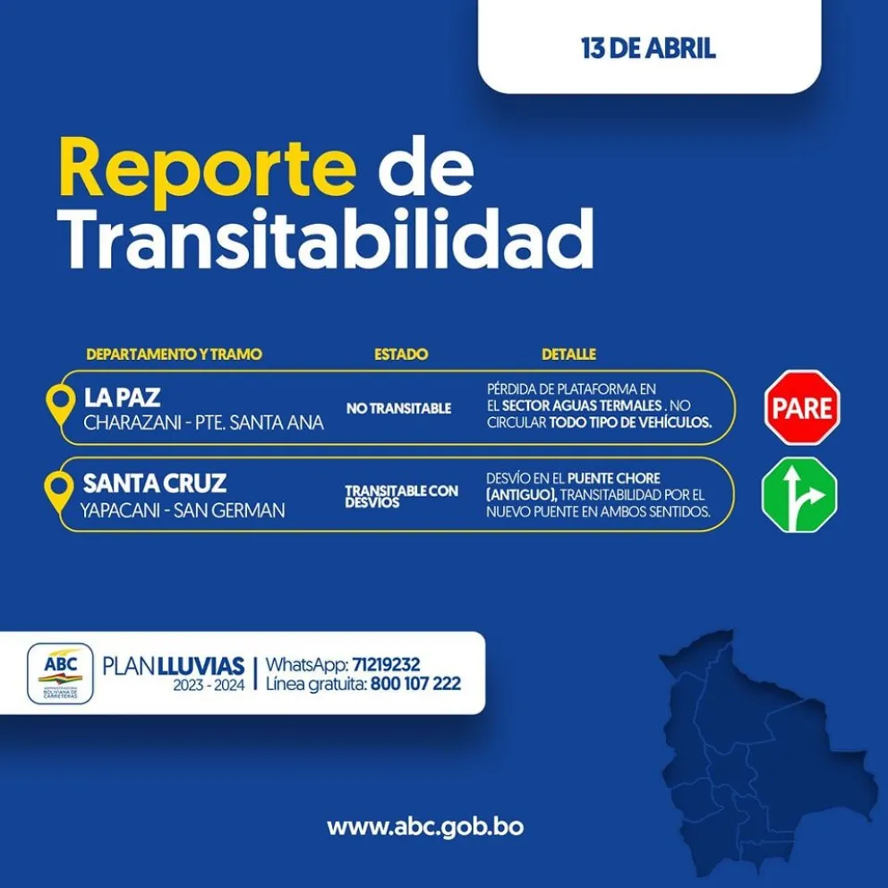 “Específicamente hubo un deslizamiento en un puente en la zona de Alcoche entre Caranavi y Guanay, vehículos grandes no pueden pasar, pero está la ABC trabajando para reponer la carretera de forma inmediata”, dijo Américo Gemio, administrador de la terminal terrestre de La Paz a Cadena A.