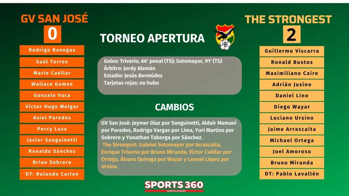 The Strongest le ganó 0-2 a GV San José en el estadio Jesús Bermúdez de Oruro, en el partido de ida de cuartos de final del torneo Apertura, que lo acercan a la semifinal por los tres puntos y también por la diferencia de goles.