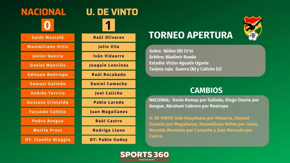 Universitario de Vinto le ganó a Nacional Potosí (1-0), en la última jugada del partido y  tiene la ventaja de definir su pase a semifinales en casa.  Maximiliano Núñez, en el octavo minuto de adición convirtió el tanto del trioun fo para el conjunto visitante.