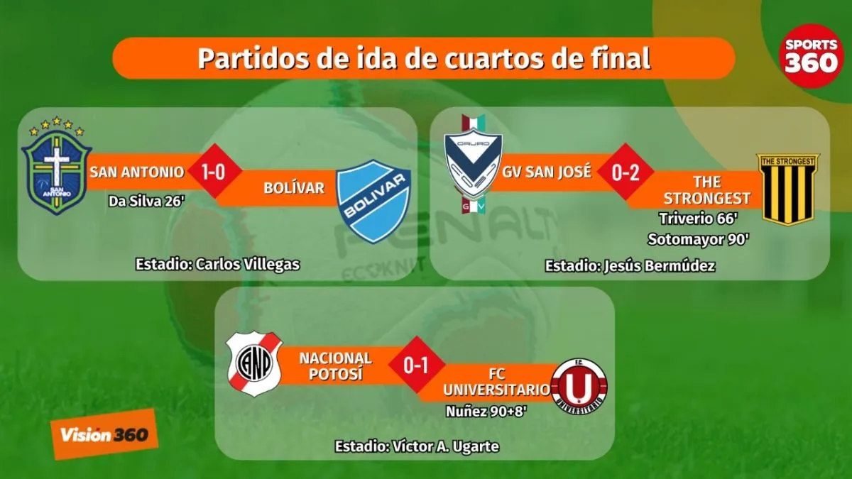 Las tres llaves de los cuartos de final que se jugaron este domingo, a falta del choque del lunes entre Independiente y Aurora, están abiertas; aunque The Strongest, que le ganó por dos goles y de visitante a GV San José en Oruro, y Universitario de Vinto, que rescató un punto ante Nacional en Potosí, parten con ventaja en los partidos de vuelta en el objetivo de avanzar a las semifinales del torneo Apertura de la División Profesional.